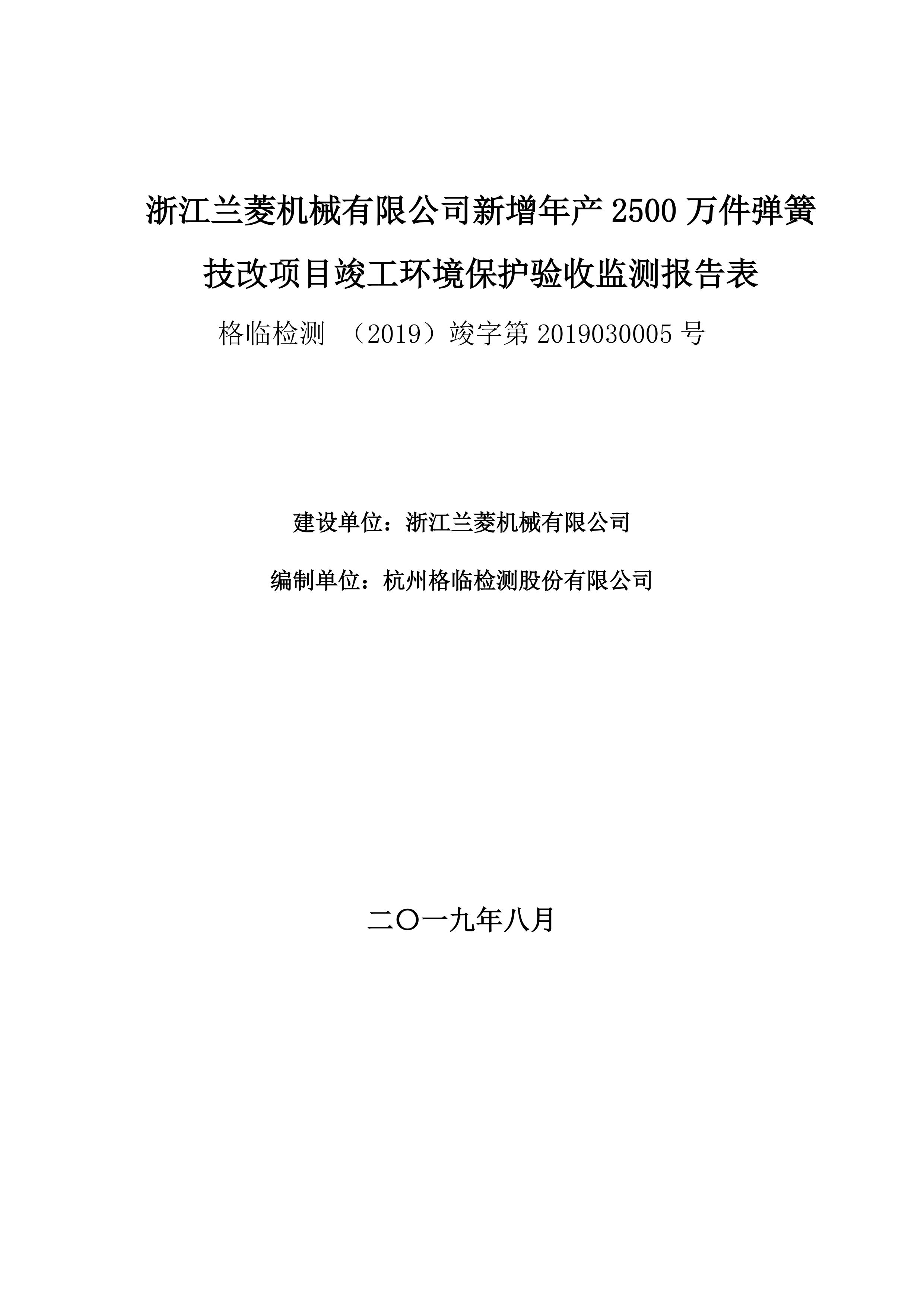 委托書號181301竣字2019030005號浙江蘭菱機械有限公司新增年產2500萬件彈簧技改項目“三同時”竣工環(huán)境保護驗收監(jiān)測報告表