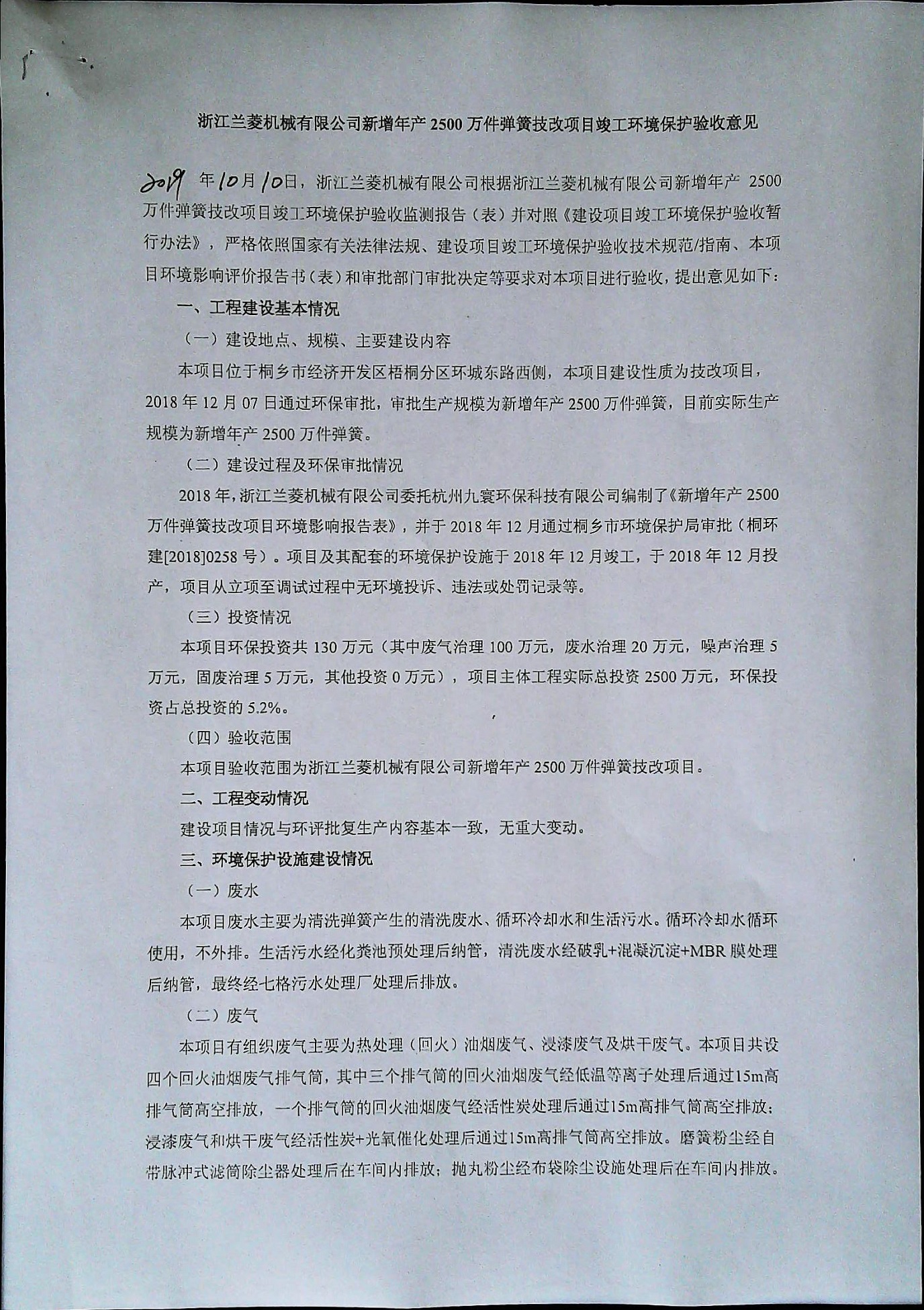 浙江蘭菱機械有限公司新增年產2500萬件彈簧技改項目竣工環(huán)境保護驗收意見